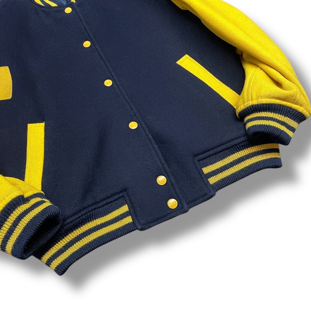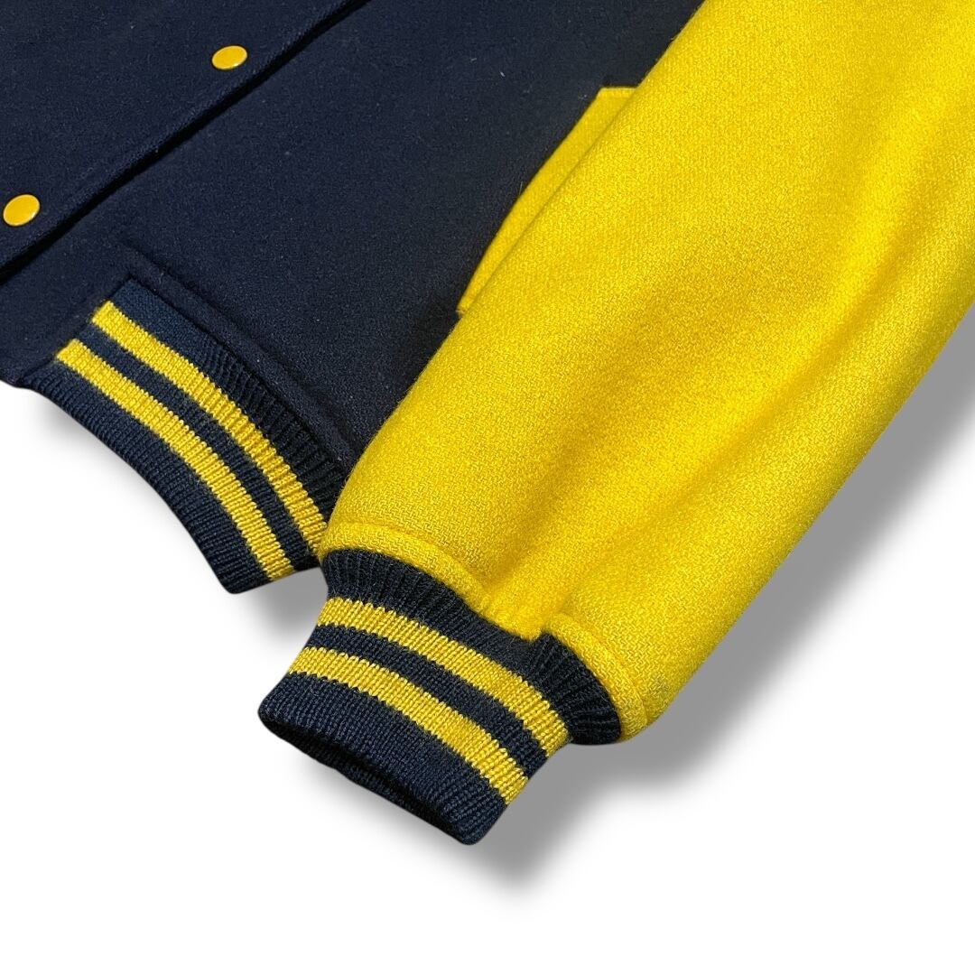深みのあるネイビーのメルトンウールボディに、鮮やかなイエロースリーブのコントラスト。