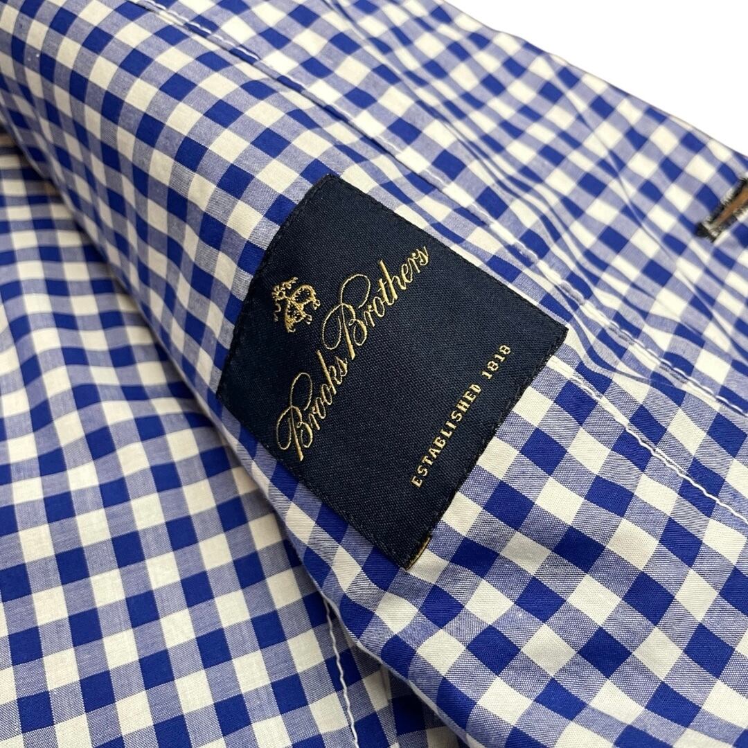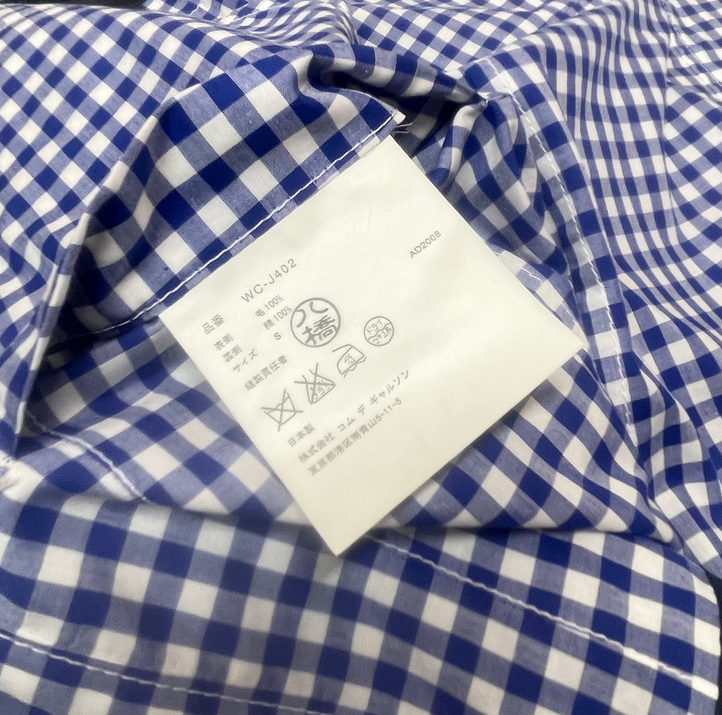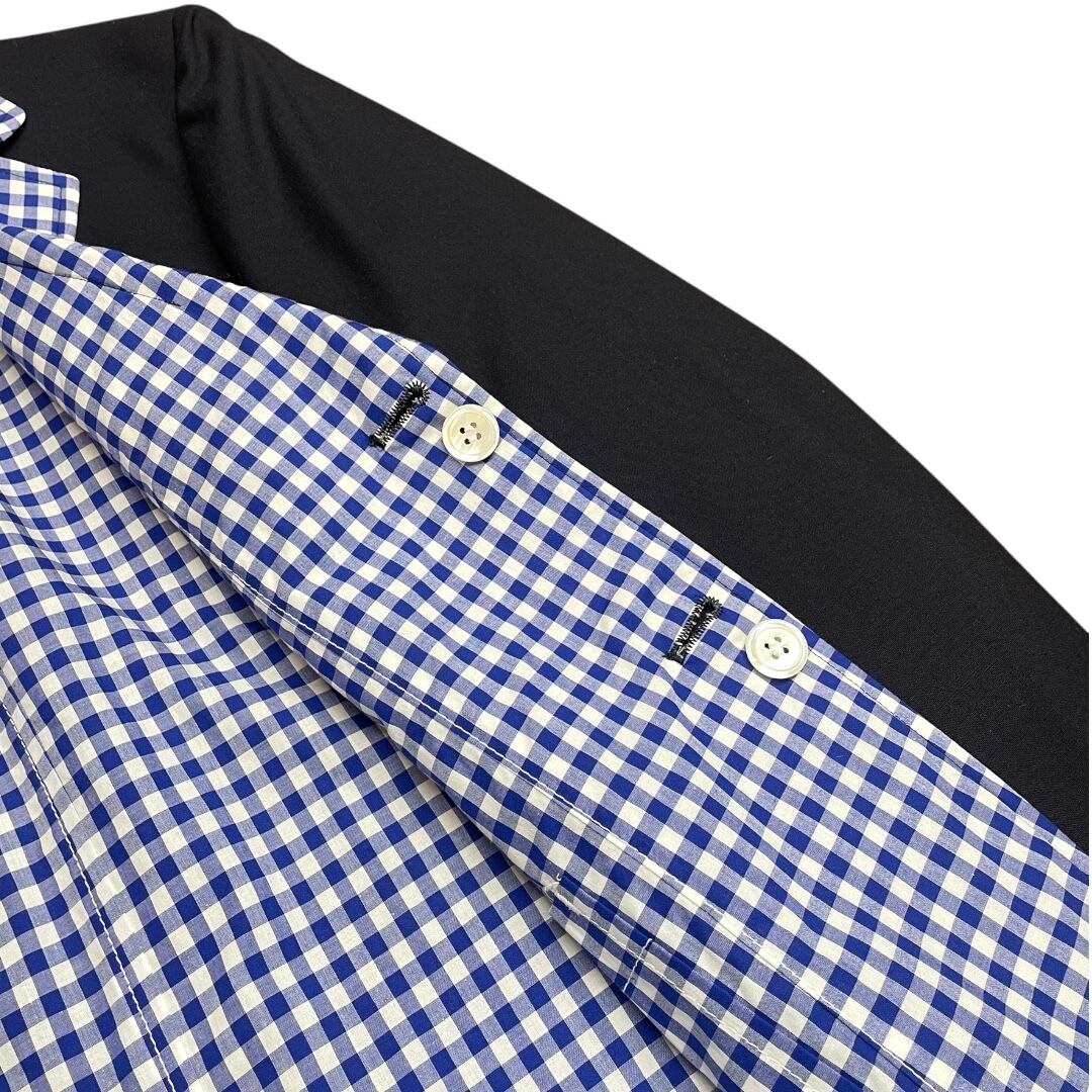 クラシックなネイビーのブレザースタイルをベースにしながら、裏地やラペル、袖口、裾にかけて大胆に配されたブルー×ホワイトの爽やかなギンガムチェックが印象的なデザイン。伝統的なアメリカントラッドの象徴である Brooks Brothers のディテールを活かしつつ、Junya Watanabe ならではの再構築的なアプローチによってモード感のある仕上がりとなっています。