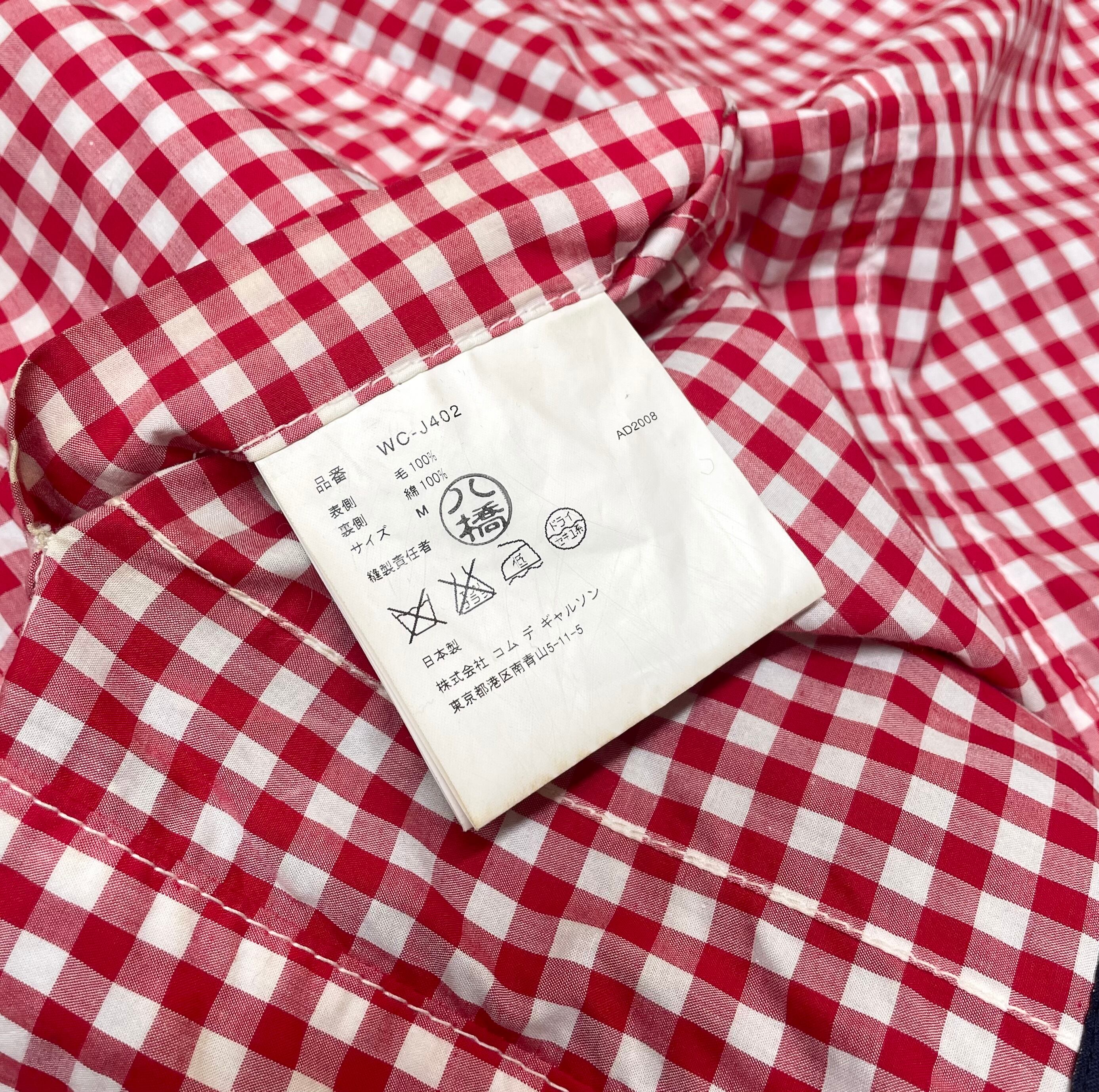 クラシックなブラックのブレザースタイルをベースにしながら、裏地やラペル、袖口、裾にかけて大胆に配されたレッド×ホワイトのクラシックなギンガムチェックが印象的なデザイン。伝統的なアメリカントラッドの象徴である Brooks Brothers のディテールを活かしつつ、Junya Watanabe ならではの再構築的なアプローチによってモード感のある仕上がりとなっています。