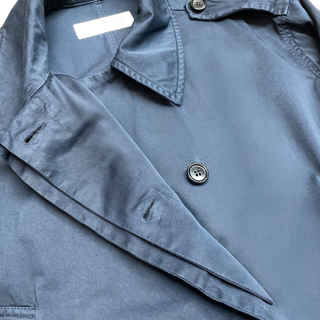 ミリタリーウェアを思わせるエポレット付きのショルダーデザインに、ミニマルな比翼フロントを組み合わせたクリーンな佇まい。やや光沢のあるコットン素材が使用されており、上品さと軽やかさを兼ね備えた仕上がりです。