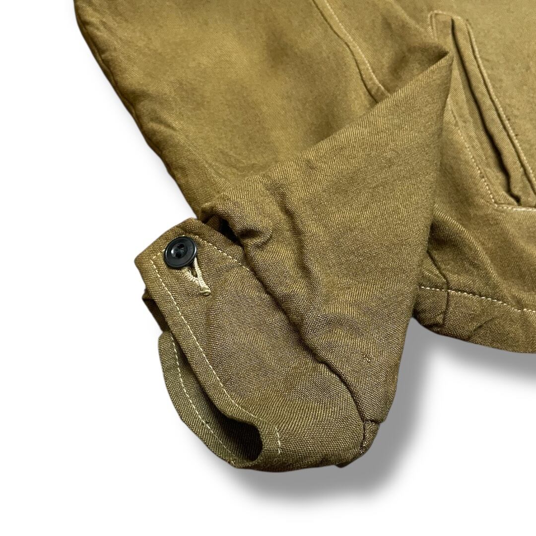 程よく肉厚で落ち感のある生地は、1950年代頃のヴィンテージジャケットに見られるレーヨンギャバ特有のドレープ感と上品な光沢を感じさせる一着です。